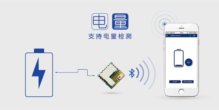 將模塊AD引腳連接電源,輕松獲取電池電量,手機(jī)APP通過模塊內(nèi)置的電池檢測(cè)服務(wù)(Battery Service)輕松讀取當(dāng)前電池電量。