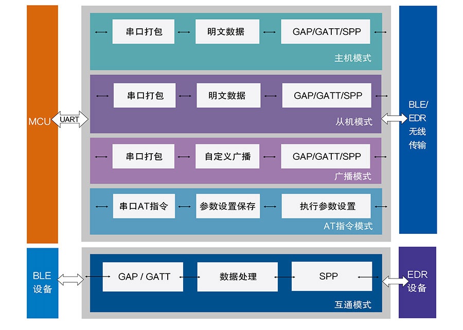 如果有些特殊項目必須在EDR與BLE兩個不同模式下建立數(shù)據(jù)傳輸方式,可采用互通模式;
