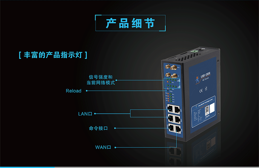 USR-G808區(qū)別于之前的工業(yè)路由器,除了是雙卡雙模式之外,就是有4個LAN口、1個WAN口,還有1個命令接口,方便對設(shè)備進行后續(xù)管理。