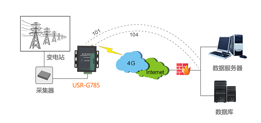 按照電力101協(xié)議傳輸數(shù)據(jù),DTU作為子站端的一部分,只需將數(shù)據(jù)通過串口發(fā)給DTU,USR-G785就會將101報文發(fā)送給服務器。