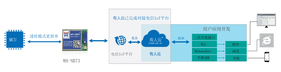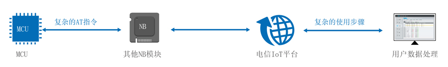 第二種傳輸形式,用戶在使用其他NB模塊、未接入有人云狀態(tài)下,MCU需要進(jìn)行復(fù)雜的AT指令操作,服務(wù)器仍要通過一系列復(fù)雜的操作環(huán)節(jié)才能實(shí)現(xiàn)數(shù)據(jù)透?jìng)?,耗費(fèi)時(shí)間和精力。