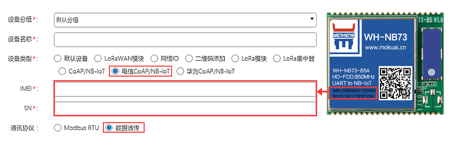 選擇“電信CoAP/NB-IoT”,填寫IEMI和SN,選擇數(shù)據(jù)透?jìng)鳌?/span>