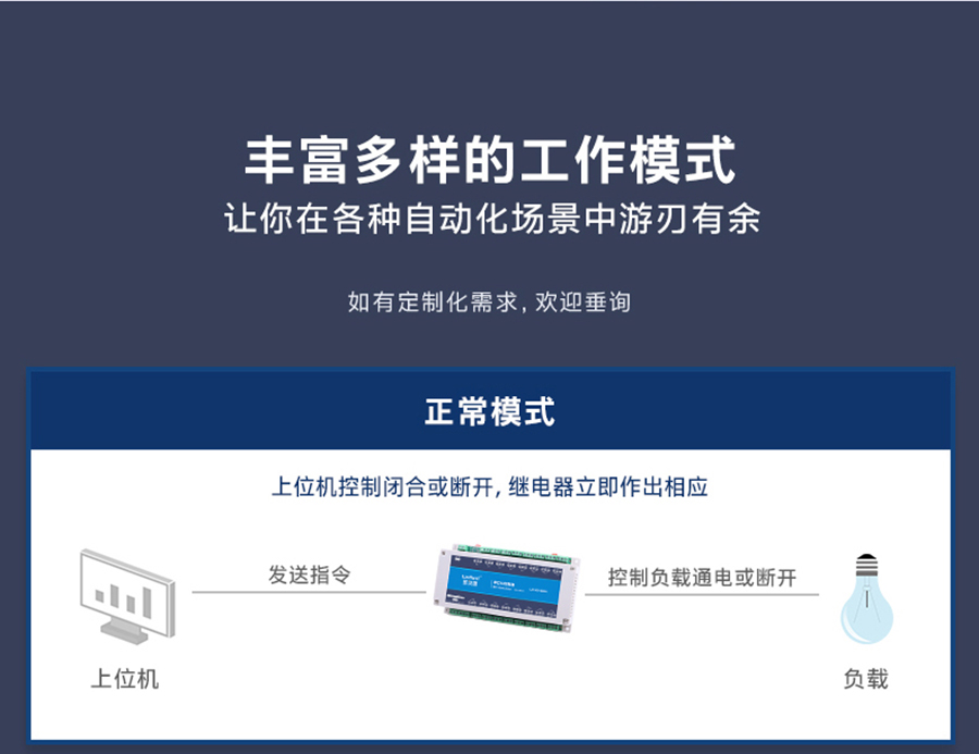 工作模式更改;繼電器獨(dú)立控制;繼電器整體控制;開(kāi)關(guān)量狀態(tài)查詢;調(diào)試信息查詢;控制軟件;支持各家組態(tài)軟件;支持 Labview 等