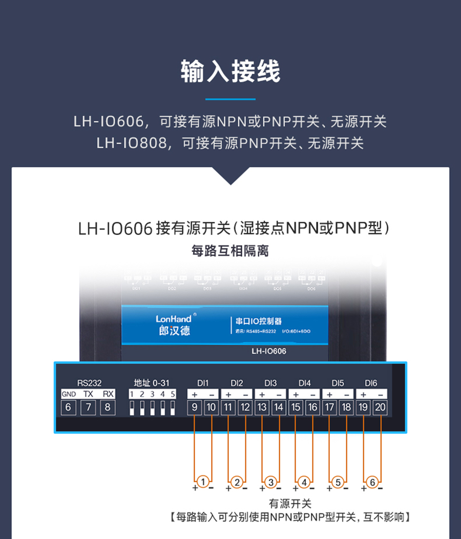 郎漢德品牌下的,LH-IO 系列產(chǎn)品是采用標(biāo)準(zhǔn) Modbus- RTU 協(xié)議的繼電器設(shè)備,支持 RS485/232或網(wǎng)絡(luò)通信。支持寬電壓供電,多路輸入輸出控制,可廣泛應(yīng)用于工業(yè)生產(chǎn)、農(nóng)業(yè)、智慧城市、寫字樓等各類應(yīng)用場(chǎng)景。本系列產(chǎn)品型號(hào)種類豐富,供用戶選擇