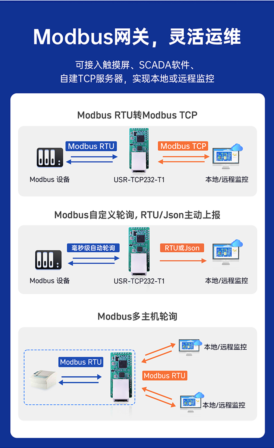 支持ModbusTCP/RTU協(xié)議轉(zhuǎn)換、Modbus多主機輪詢、Modbus自定義輪詢