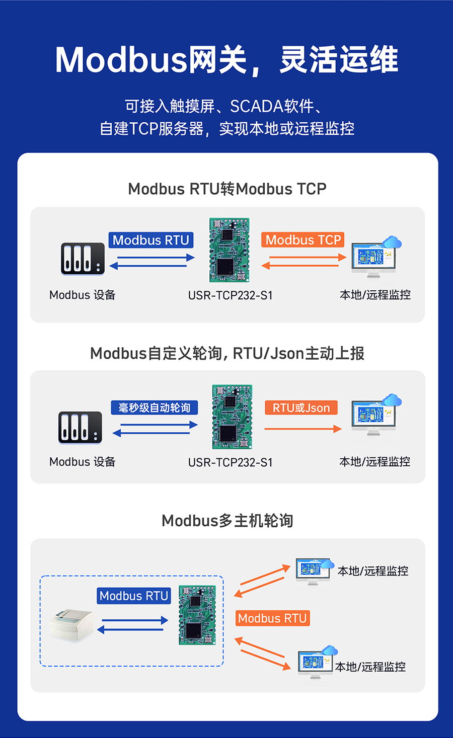 支持ModbusTCP/RTU協(xié)議轉(zhuǎn)換、Modbus多主機(jī)輪詢、Modbus自定義輪詢