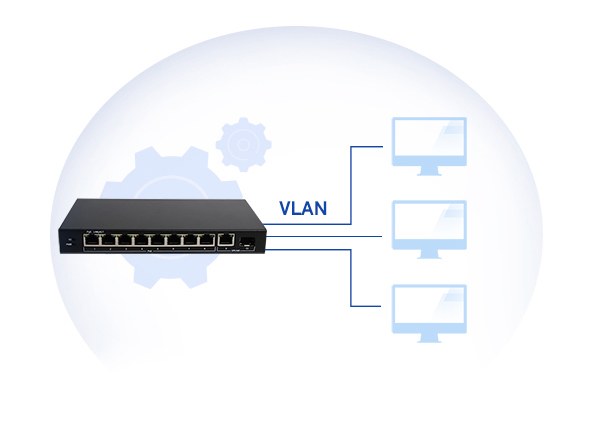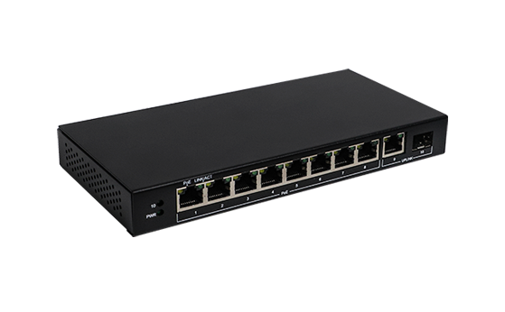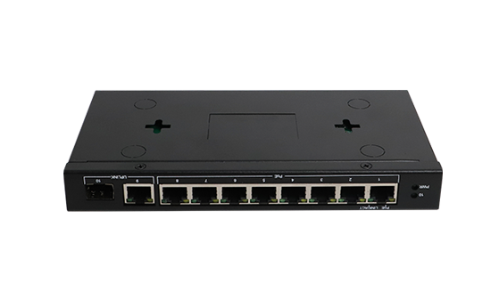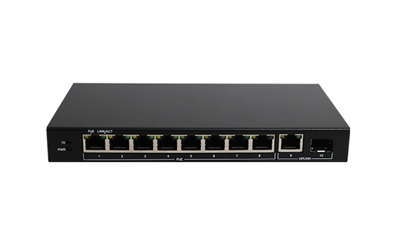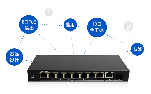 S1210P | 10口全千兆以太網(wǎng)PoE交換機 SFP千兆上聯(lián)光口, 符合節(jié)能規(guī)范, 一鍵VLAN功能 S1210P是一款8千兆POE電口+1個千兆上聯(lián)電口+1個SFP光口的交換機,其中8個千兆PoE電口支持POE輸出,符合IEEE 802.3af/at標準,單端口供電功率最高達30W, 整機供電功率最大60W。上行端口包含1個10/100/1000Mbps電口和1個千兆SFP光口。所有端口均支持線速轉(zhuǎn)發(fā),速率最高可達1000M,且支持MDI/MDIX自動翻轉(zhuǎn)功能和速率自協(xié)商。本產(chǎn)品即插即用,使用簡單,無需任何設(shè)置。機身材質(zhì)采用磨砂金屬鐵殼工藝制造,滿足寬溫工作環(huán)境要求,且能抗壓、耐磨、防爆。