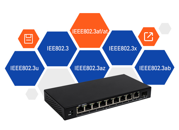 - 符合IEE802.3 、IEEE802.3u 、IEEE802.3x 、IEEE802.3az、IEEE802.3ab、IEEE802.3af/at標準