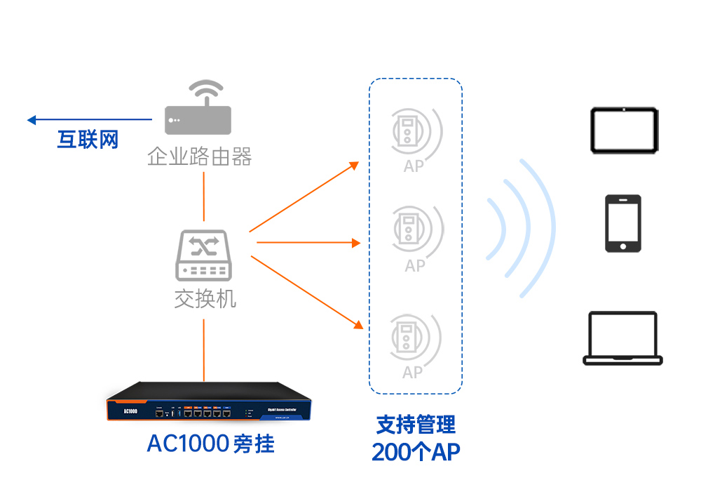 強(qiáng)大的硬件+靈活的組網(wǎng) AC1000旁掛使用,不直接連接到無(wú)線AP,而是通過(guò)網(wǎng)絡(luò)交換機(jī)連接。這種組網(wǎng)方式通常用于分布式網(wǎng)絡(luò)環(huán)境,AP數(shù)量相對(duì)較多,上網(wǎng)流量不經(jīng)過(guò)AC,優(yōu)異的性能讓設(shè)備可以同時(shí)管理200個(gè)AP。