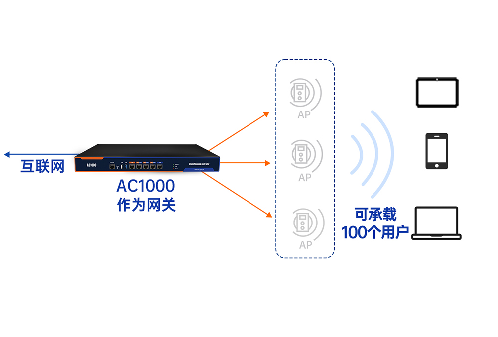 強(qiáng)大的硬件+靈活的組網(wǎng) AC1000作為網(wǎng)關(guān)使用,直接連接到無(wú)線AP。這種組網(wǎng)方式通常用于集中式網(wǎng)絡(luò)環(huán)境,AP數(shù)量相對(duì)較少,所有上網(wǎng)流量經(jīng)過(guò)AC,優(yōu)異的性能讓設(shè)備可以承載100個(gè)用戶的同時(shí)接入。