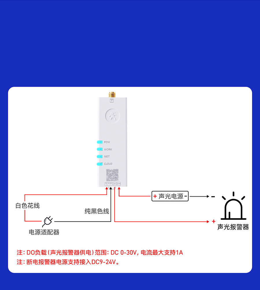 報(bào)警器的供電負(fù)極,斷電報(bào)警器的“DO”接到聲光報(bào)警器的供電正極