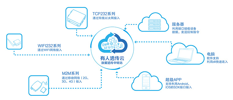 產(chǎn)品支持接入“有人透傳云系統(tǒng)”,實(shí)現(xiàn)設(shè)備與網(wǎng)絡(luò)終端的跨網(wǎng)絡(luò)數(shù)據(jù)傳輸。輕松實(shí)現(xiàn)遠(yuǎn)程數(shù)據(jù)采集、遠(yuǎn)程控制功能。