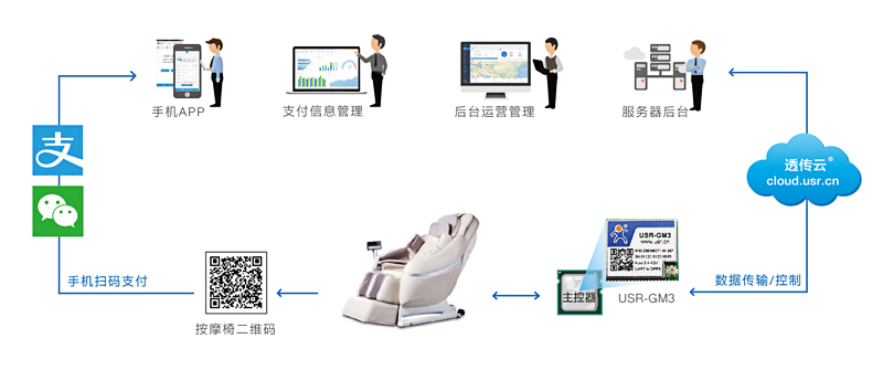 用戶掃描共享按摩椅上面的二維碼,借助支付寶/微信完成支付;按摩椅中的主控器接收到指令開(kāi)始工作。
