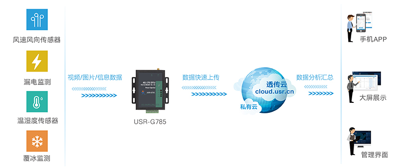 1、輸變電設(shè)備通過多種傳感器將探測到的溫濕度、風(fēng)速、風(fēng)向、漏電、覆冰等數(shù)據(jù)信息,通過4G DTU USR-G785快速上傳至輸電線路在線監(jiān)測中心;