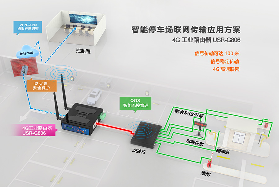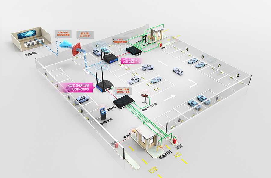 1、當(dāng)車輛離場時,終端識別和傳感設(shè)備會自動采集車輛號牌等信息,并通過4G工業(yè)無線路由器USR-G806傳輸至遠(yuǎn)程控制中心;