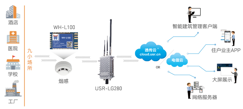 1、將LoRa無線傳輸模塊WH-L100-L嵌入獨立式煙感,搭配LoRa集中器USR-LG280組網(wǎng)工作