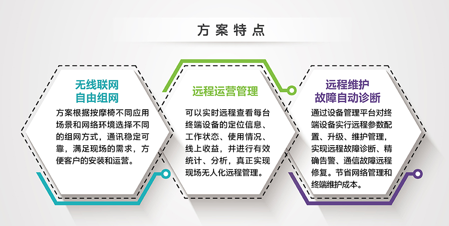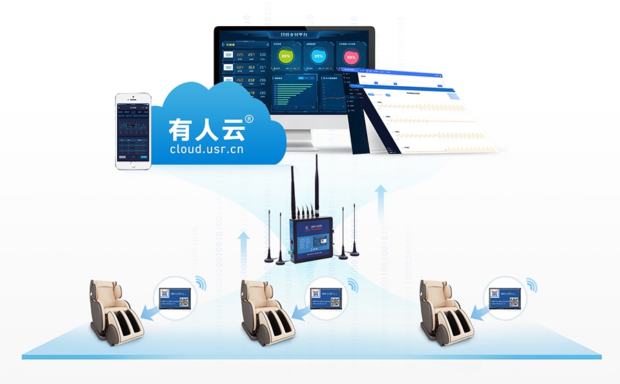 為方便運(yùn)營商通過平臺管理和監(jiān)控所有按摩椅,為滿足不用應(yīng)用場景,有人物聯(lián)網(wǎng)提出了基于無線通信技術(shù)的共享按摩解決方案,主要實(shí)現(xiàn)共享按摩椅的資產(chǎn)定位、機(jī)器運(yùn)行狀態(tài)數(shù)據(jù)的實(shí)時監(jiān)控、信息靈活組網(wǎng)傳輸、遠(yuǎn)程控制等功能。