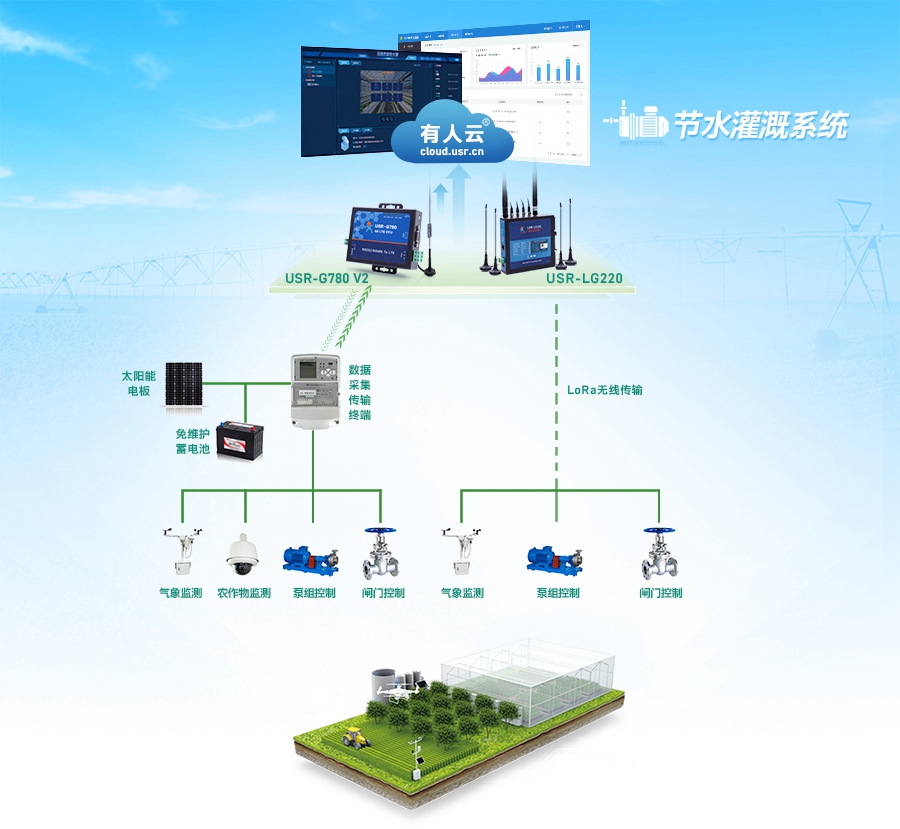 農(nóng)業(yè)節(jié)水灌溉系統(tǒng)主要由土壤水分傳感器、氣象監(jiān)測站、閥泵控制、視頻、采集控制終端、無線通訊模塊、光伏電源系統(tǒng)以及有人云農(nóng)業(yè)管理監(jiān)控平臺等組成。系統(tǒng)整合區(qū)域內(nèi)水文水情、氣象作物、工情等信息,實現(xiàn)了信息的采集、統(tǒng)計、分析、控制、調(diào)度等功能。為灌區(qū)管理部門提供科學決策依據(jù),提升灌區(qū)的管理效能,實現(xiàn)農(nóng)業(yè)灌溉自動化。