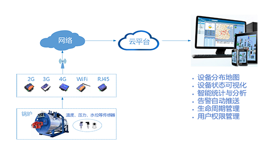 通過2G/3G/4G網(wǎng)絡或?qū)拵ЬW(wǎng)絡實現(xiàn)鍋爐設備聯(lián)網(wǎng),實時接收鍋爐設備運行參數(shù),如溫度、水位、壓力參數(shù)等,并進行存儲和管理。通過瀏覽器或手機客戶端實時顯示所有已聯(lián)網(wǎng)設備的實時運行情況,對鍋爐狀態(tài)數(shù)據(jù)進行智能分析,為設備運維階段故障分析、高效管理和穩(wěn)定運行提供有力支持。