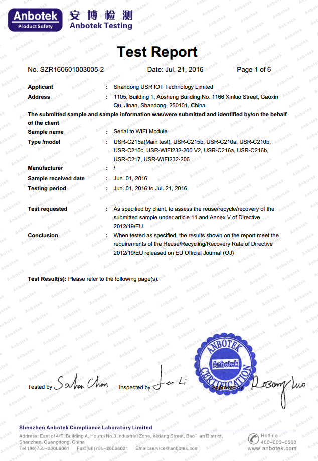 WIFI串口服務(wù)器 ROHS 認(rèn)證