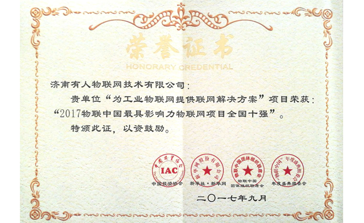 物聯(lián)中國-最具影響力企業(yè)10強(qiáng)證書